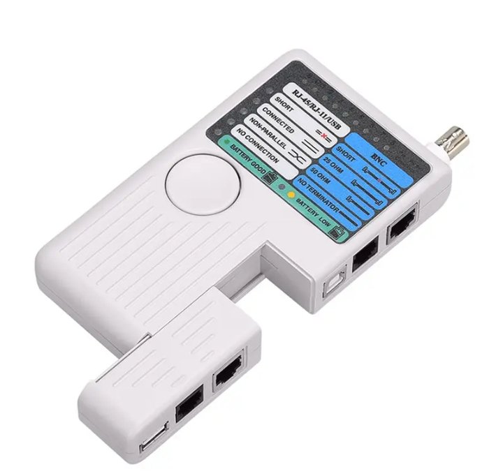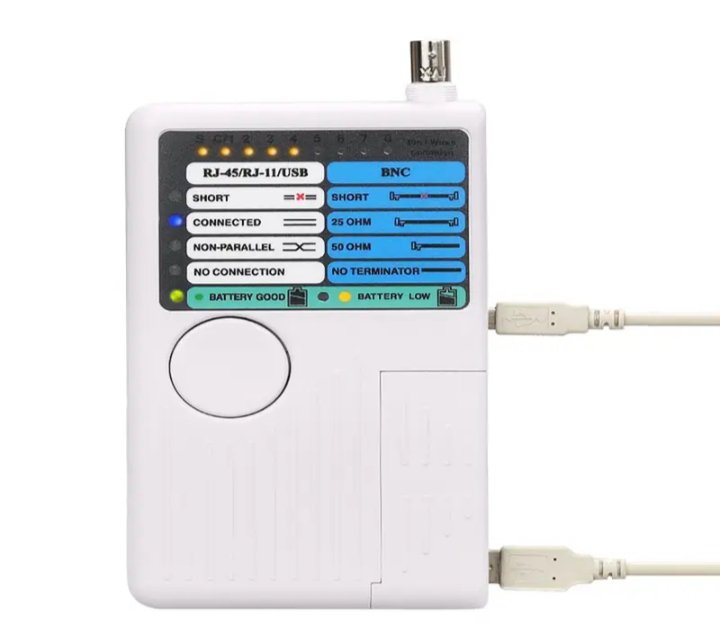 الميزات: جهاز اختبار كابلات عن بعد يختبر 4 أنواع كابلات (ار جي 45، ار جي 11، يو اس بي، بي ان سي) اختبار بسيط بزر واحد.