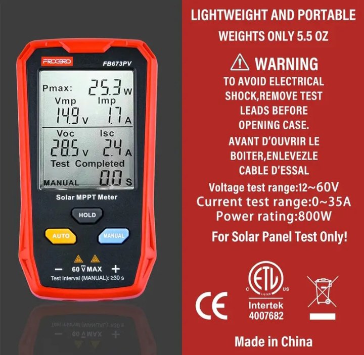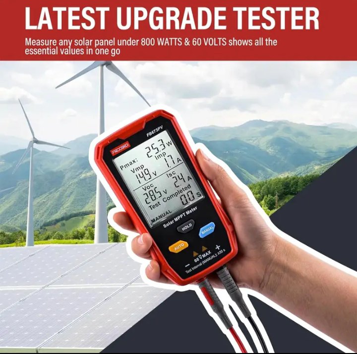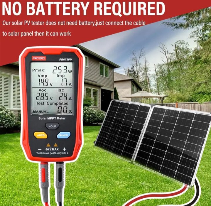 جهاز قياس الألواح الشمسية الكهروضوئية المتعدد 800 وات – جهاز قياس MPPT للطاقة الشمسية مع شاشة LCD كبيرة فائقة الوضوح أداة مساعدة لاستكشاف أخطاء جهد الدائرة المفتوحة MPPT الذكية وإصلاحها لاختبار الطاقة الشمسية الكهروضوئية / موديل FB673PV