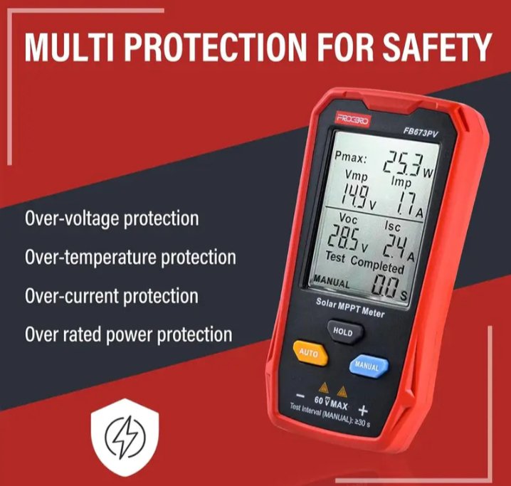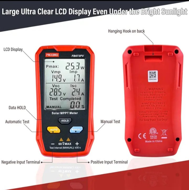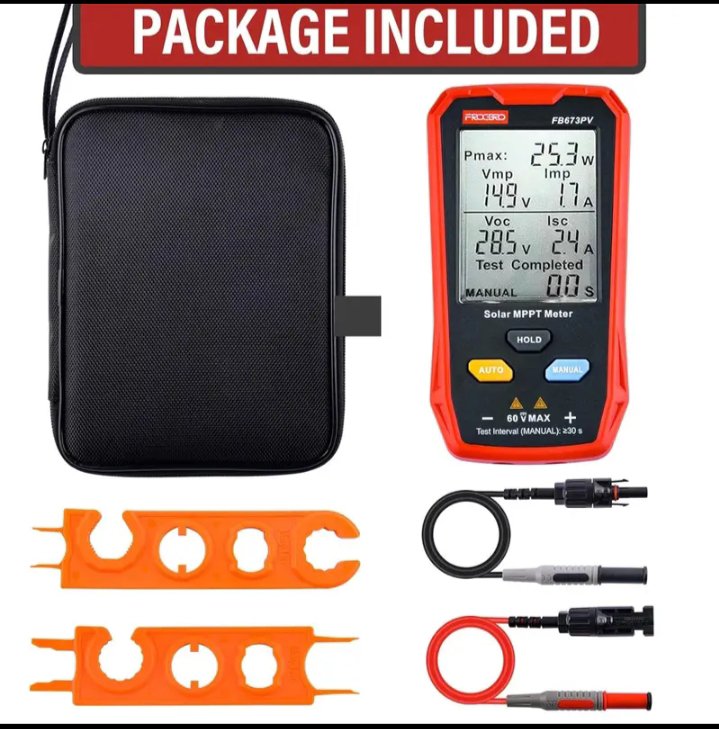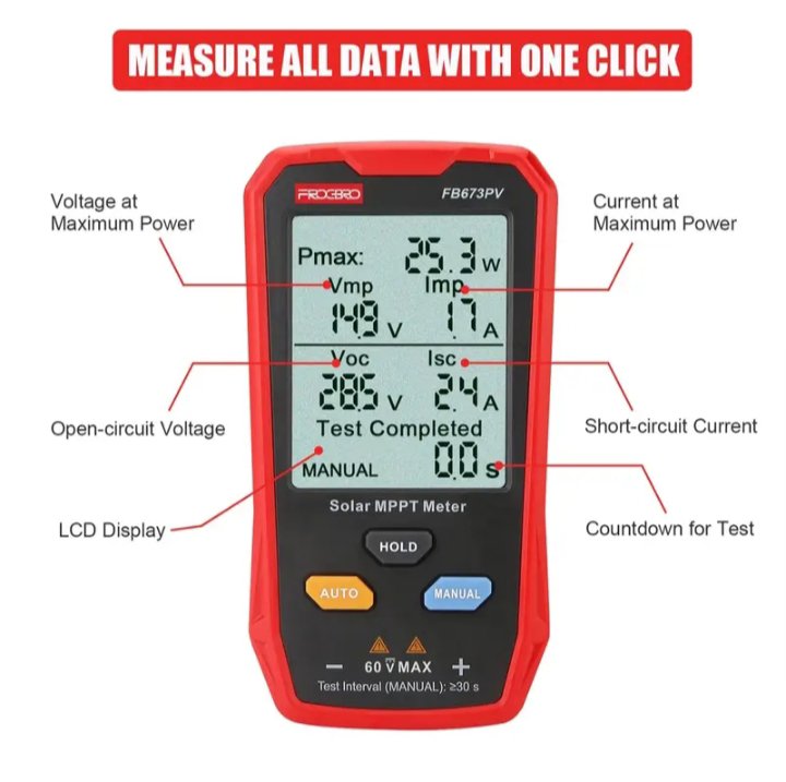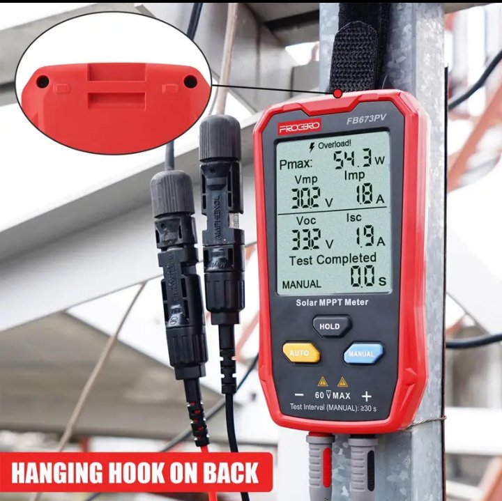 【FB673PV مقياس MPPT للطاقة الشمسية 】مع قدرات سريعة ودقيقة، يمكن لمقياس اختبار الألواح الشمسية تقييم الحد الأقصى لإخراج الطاقة (Pmax)، وجهد الدائرة المفتوحة (Voc)، وتيار الدائرة القصيرة (Isc) في وقت واحد، وتقديم جميع البيانات ذات الصلة على عرضها الواضح. يُستخدم هذا الجهاز متعدد الاستخدامات على نطاق واسع في تقييم الألواح الشمسية واستكشاف أخطاء الوحدات المعيبة وإصلاحها. يميز جهاز اختبار الألواح الشمسية أيضًا الجودة بين العلامات التجارية للألواح الشمسية ويساعد في العثور على زوايا الموضع المثالية. لا يحتاج إلى بطارية: لا يحتاج جهاز اختبار الطاقة الشمسية الكهروضوئية إلى بطارية، فقط قم بتوصيل الكابل باللوحة الشمسية ثم يمكنه العمل. ليست هناك حاجة للبطاريات حيث يمكن إجراء القياس بسهولة لفترات طويلة. يأتي جهاز اختبار الألواح الشمسية، المزود بكابلات MC4 ومفتاح ربط MC4، جاهزًا للاستخدام دون الحاجة إلى موصلات إضافية. يسمح هذا الإعداد الانسيابي بإجراء قياسات سريعة وفعالة، بينما يعمل مفتاح ربط MC4 المتضمن على تعزيز راحة المستخدم.