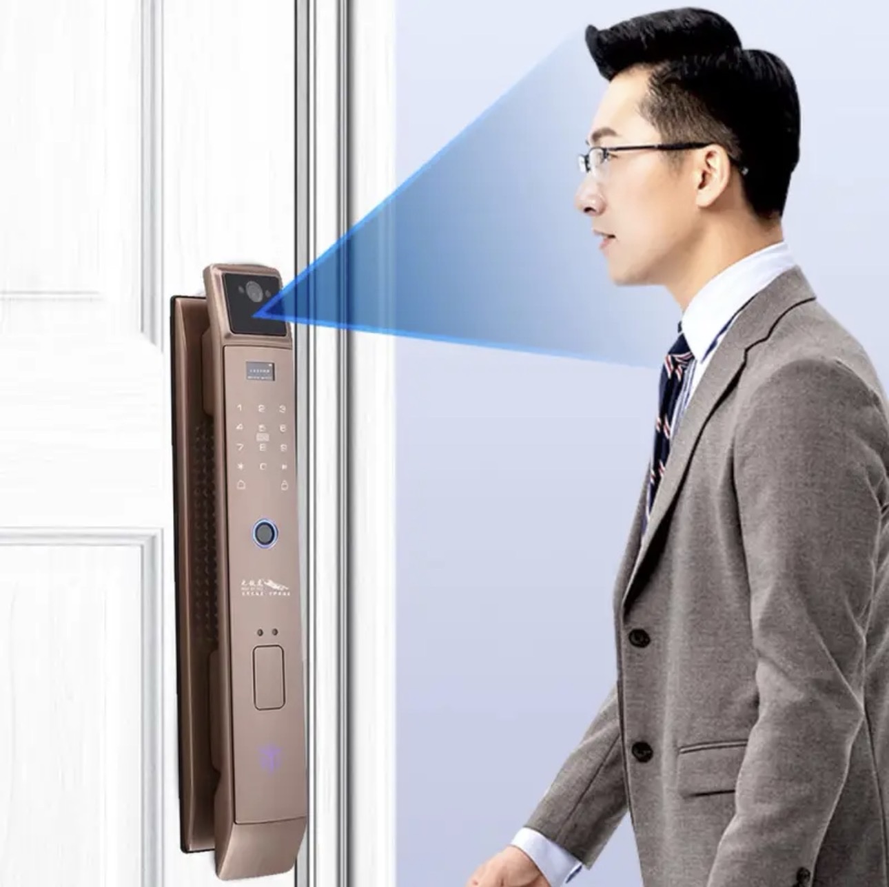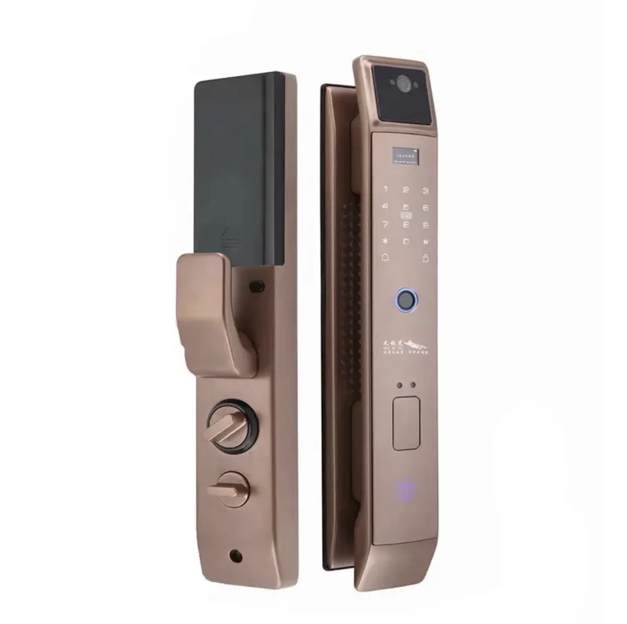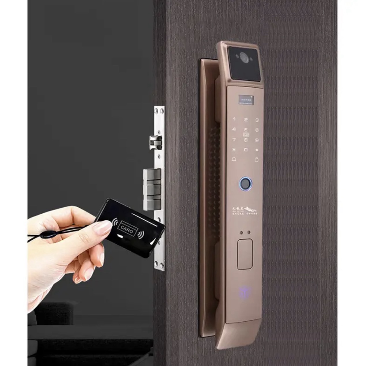 قفل الكالون الذكي مناسب لجميع أنواع الأبواب يدعم بصمة الإصبع – كلمة المرور – المفتاح – فتح الوجه – وكارت الشفرة ويمكن التحكم فيه بالكامل من خلال الموبايل لون ذهبي